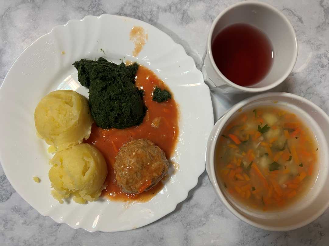 Obiad dieta łatwostrawna - krupnik jęczmienny, pulpet wieprzowo-ryżowy, ziemniaki, szpinak gotowany, Kompot.