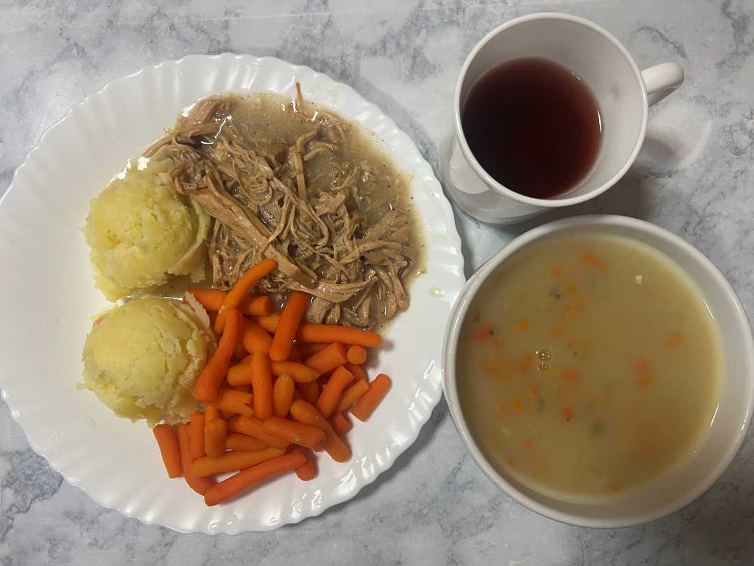 Obiad dieta łatwostrawna - zupa ziemniaczana, schab szarpany w sosie pieczeniowym z ziemniakami i gotowaną mini marchewką, kompot.