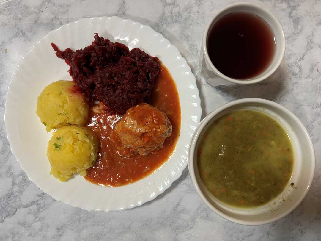 Obiad dieta łatwostrawna - zupa szpinakowa, klops wieprzowo-ryżowy w sosie pomidorowym z ziemniakami i buraczkami, kompot.