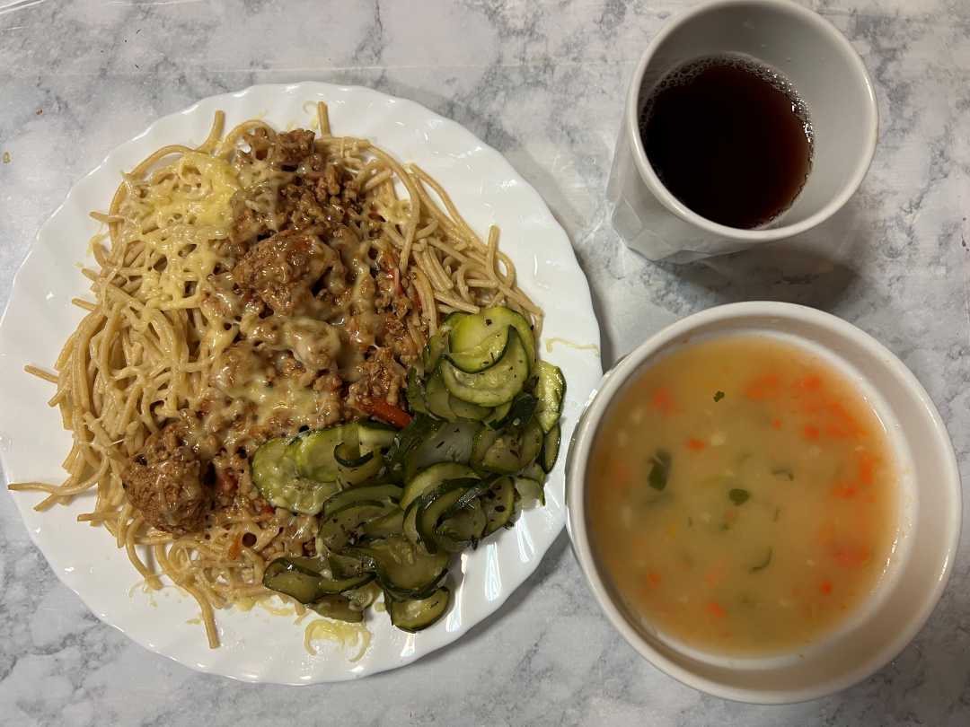 Obiad dieta łatwostrawna - zupa grysikowa, spaghetti bolognese z pieczoną cukinią, kompot.