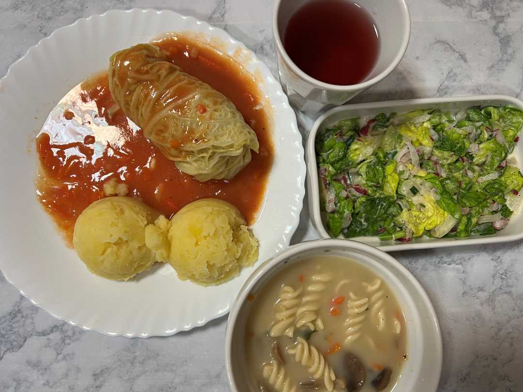 Obiad Dieta podstawowa - zupa pieczarkowa z makaronem, gołąbek wieprzowo-ryżowy w sosie pomidorowym, ziemniaki, sałata z rzodkiewką i śmietaną, kompot.