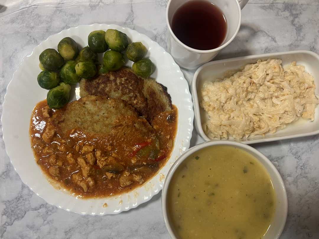Obiad Dieta podstawowa - krem z białych warzyw ze słonecznikiem, placki ziemniaczane po węgiersku z brukselką i surówką z białej rzepy i jabłka, kompot.