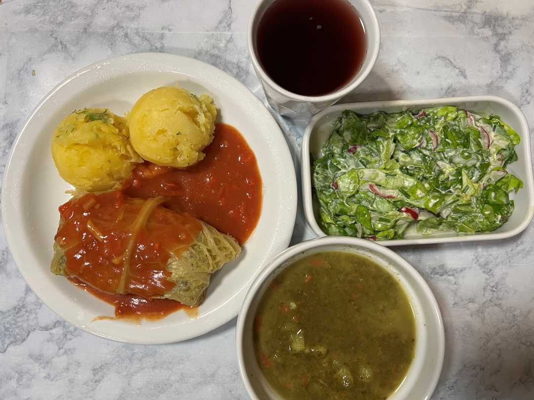 Obiad dieta podstawowa - zupa szpinakowa, gołąbek wieprzowy w sosie pomidorowym z ziemniakami i sałatą z rzodkiewką i jogurtem, kompot.