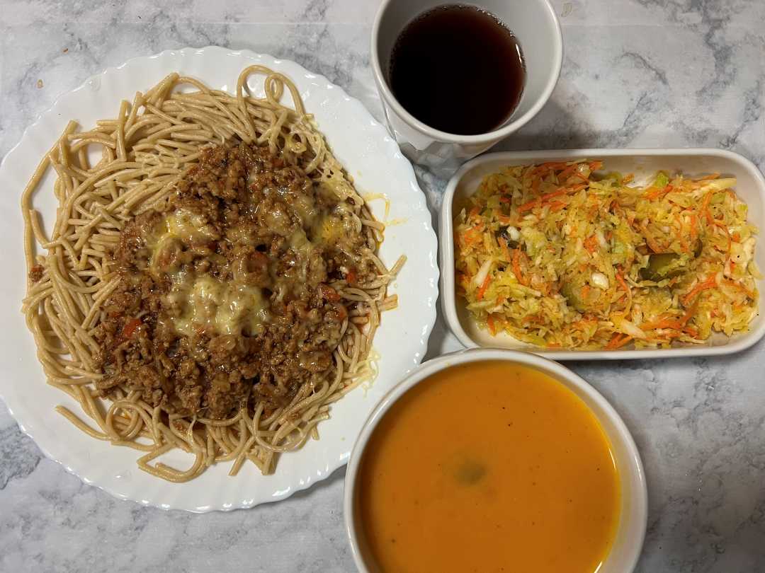 Obiad dieta podstawowa - krem z papryki, spaghetti bolognese, surówka z białej kapusty, kompot.