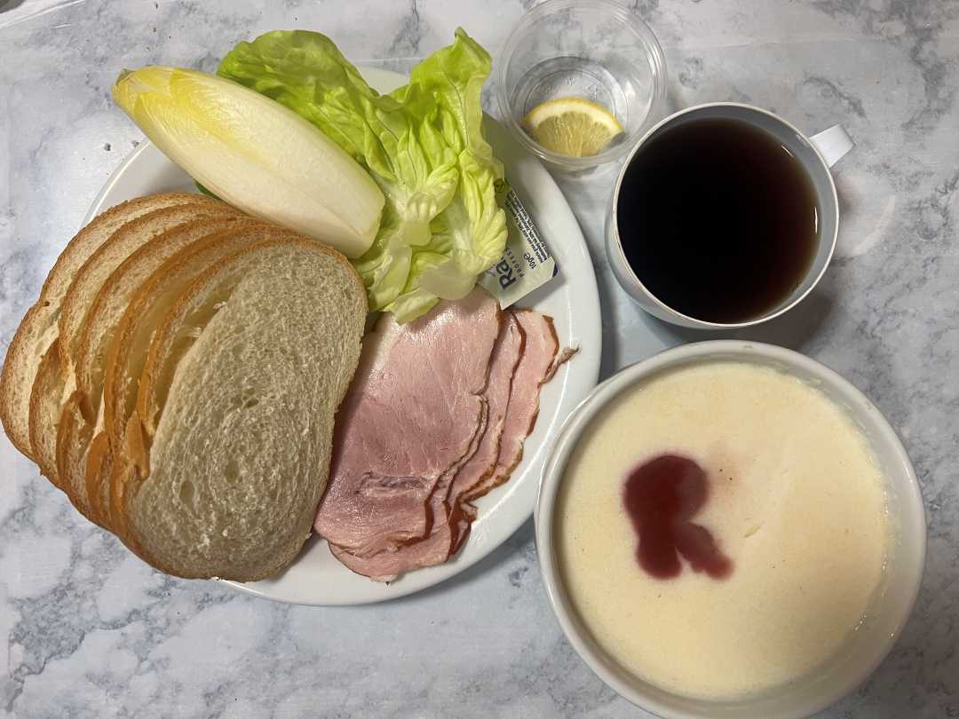 Śniadanie dieta łatwostrawna - kasza manna na mleku z musem z truskawek, bułka pszenna z margaryną, szynką od szwagra, sałatą i cykorią, herbata z cytryną.