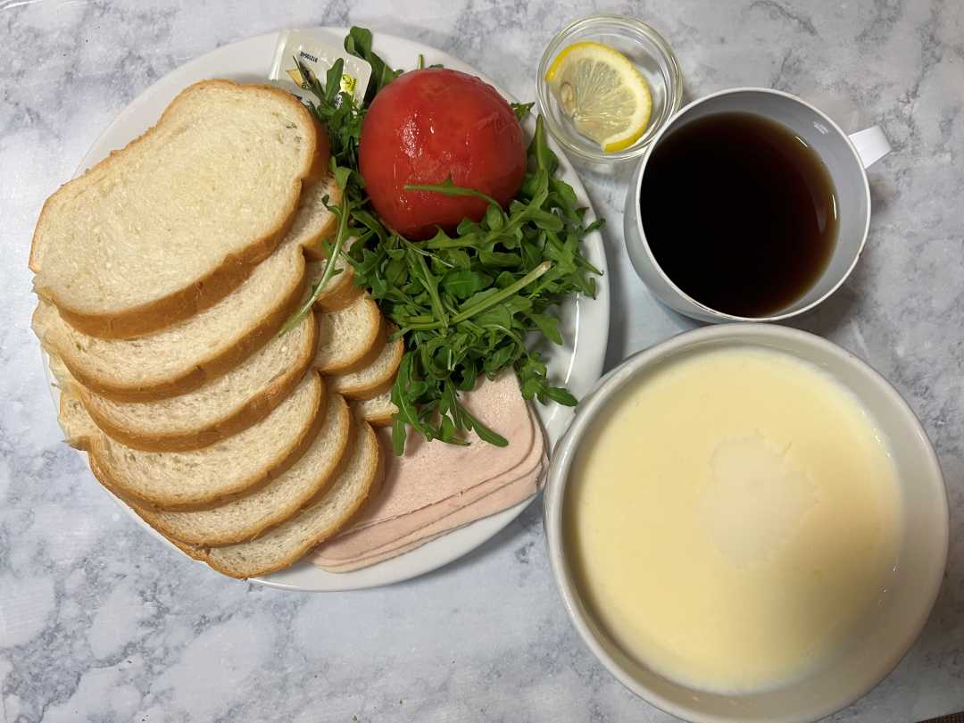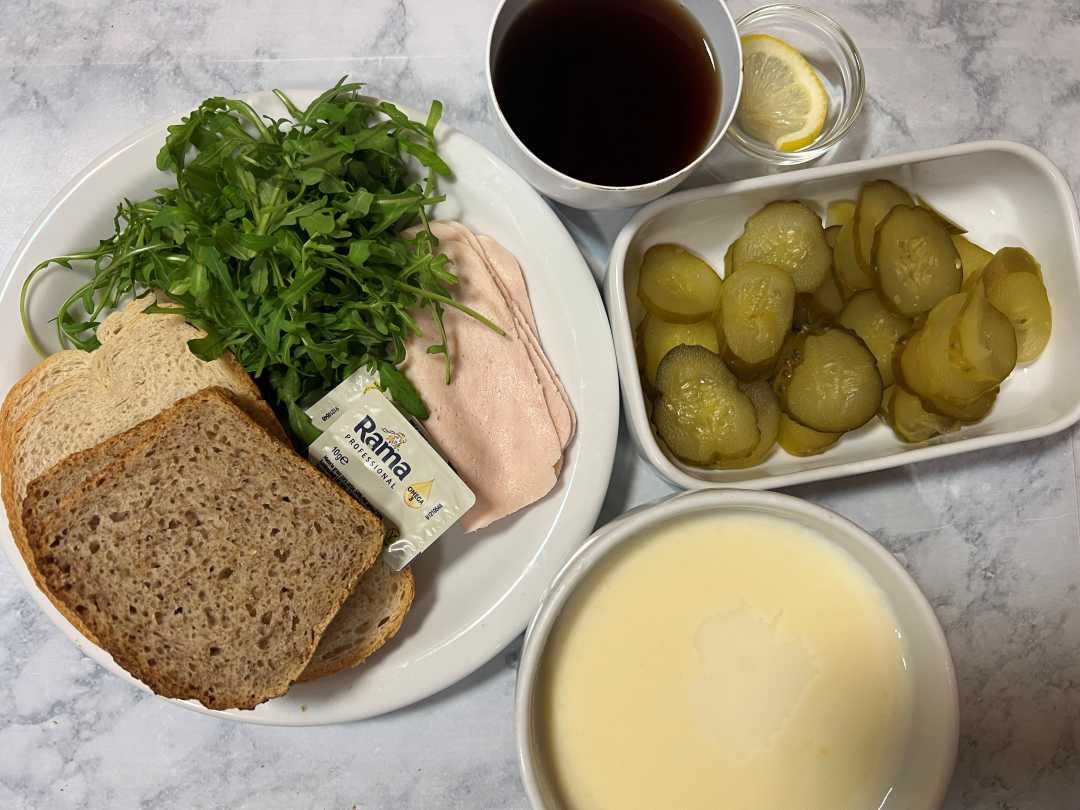Śniadanie dieta podstawowa - kasza kukurydziana na mleku, mieszane pieczywo z margaryną, rukolą, szynką tostową i ogórkiem kiszonym, herbata z cytryną.