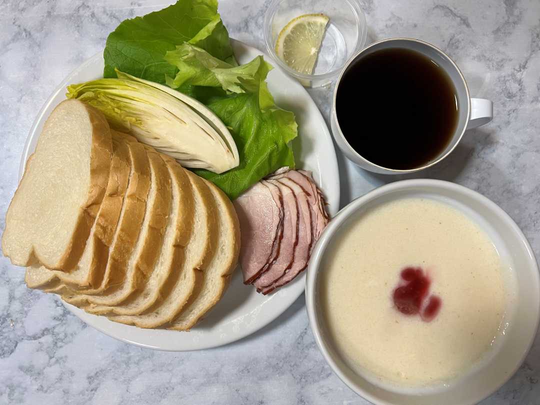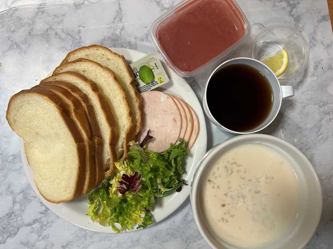 Śniadanie dieta łatwostrawna - kasza jęczmienna na mleku, bułka pszenna z margaryną, szynką dębową, miksem sałat, mus z truskawek, herbata z cytryną.