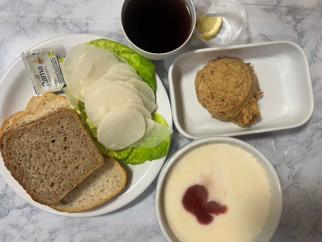 Śniadanie dieta podstawowa - kasza manna na mleku z musem z truskawek, mieszane pieczywo z margaryną, hummusem z suszonymi pomidorami, sałatą i białą rzodkwią, herbata z cytryną.