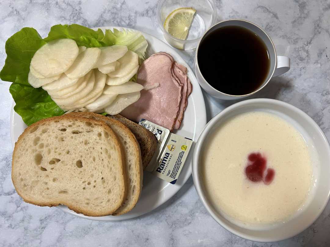 Śniadanie dieta podstawowa - kasza manna na mleku z musem z truskawek, mieszane pieczywo z margaryną, sałatą, wędliną i białą rzodkwią, herbata z cytryną.