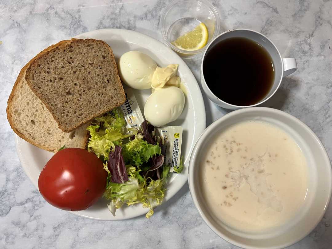 Śniadanie dieta podstawowa - kasza jęczmienna na mleku, mieszane pieczywo z margaryną, mixem sałat, jajkiem z majonezem i pomidorem, herbata z cytryną.