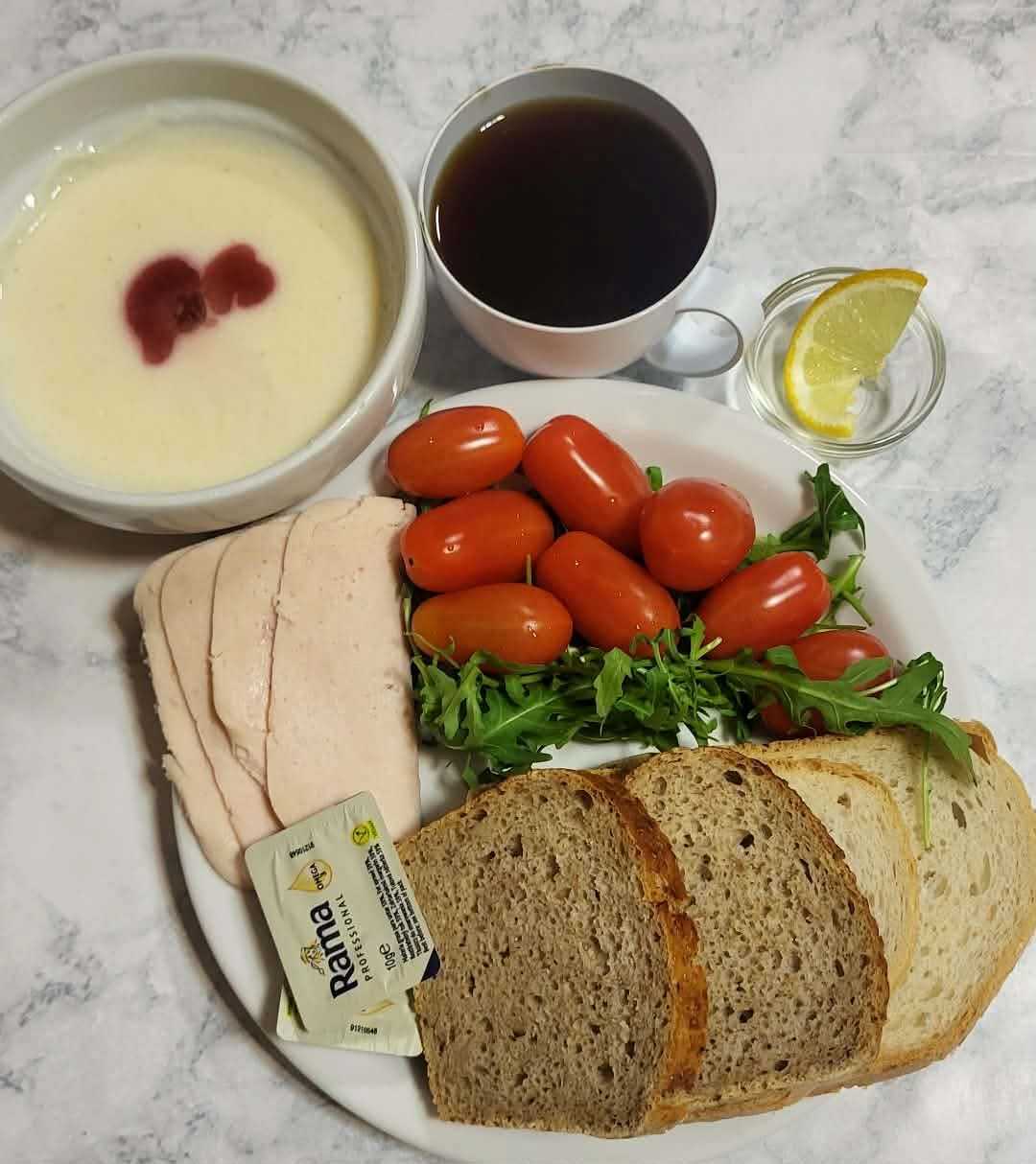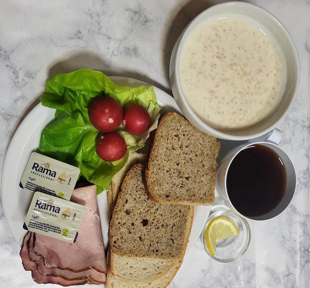 Dieta podstawowa – kasza jęczmienna na mleku, szynka, mieszane pieczywo z margaryną, sałata, rzodkiewka, herbata z cytryną