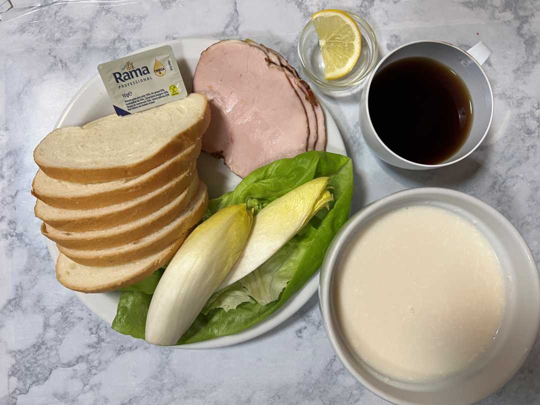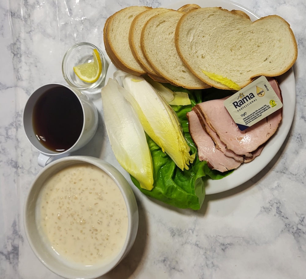 Dieta łatwostrawna -  kasza jęczmienna na mleku, szynka, bułka pszenna z margaryną, sałata zielona, cykoria, herbata z cytryną
