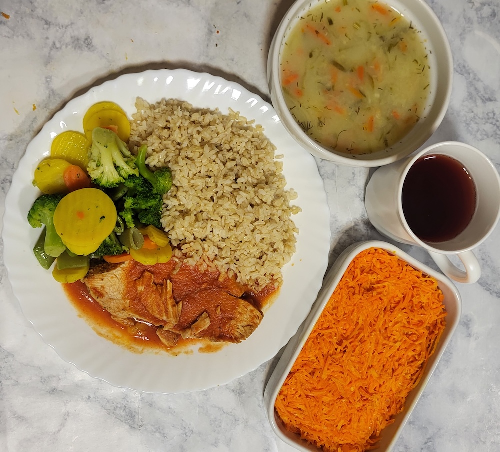 Dieta podstawowa – ogórkowa z ziemniakami, filet pieczony z indyka w sosie pomidorowo-paprykowym, ryż brązowy, bukiet warzyw, kompot