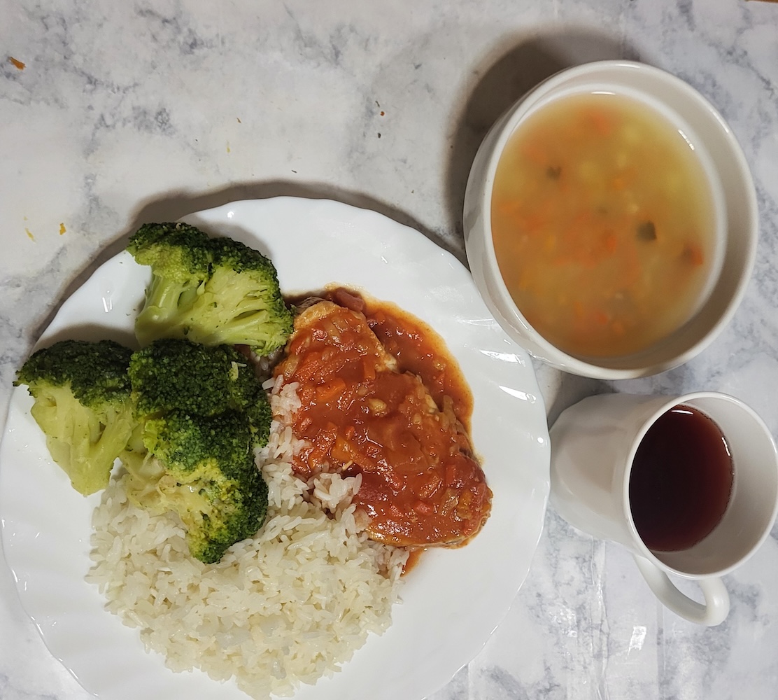Dieta łatwostrawna -  krupnik jęczmienny, filet pieczony z indyka w sosie pomidorowym, ryż,  brokuł gotowany, kompot