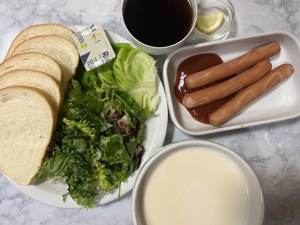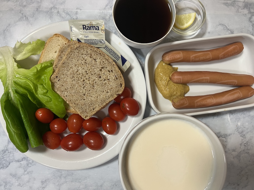 Dieta podstawowa - ryż na mleku, parówki z musztardą, mieszane pieczywo z margaryną, sałata, pomidorki koktajlowe, herbata z cytryną