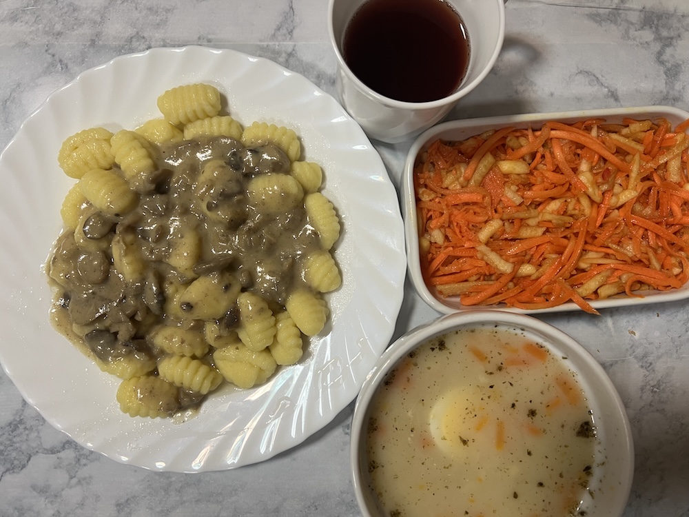 Dieta podstawowa - barszcz biały z jajkiem, gnocchi w sosie pieczarkowym, surówka z marchwi i jabłka, kompot
