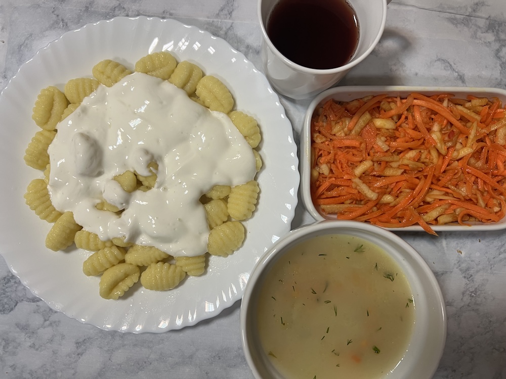 Dieta łatwostrawna - zupa koperkowa, gnocchi z jogurtem, surówka z marchwi i jabłka, kompot