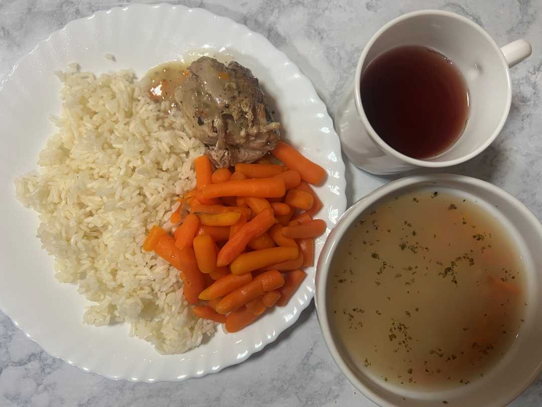 Obiad dieta łatwostrawna - zupa ziemniaczana, udziec kurczaka w sosie ziołowym z ryżem i mini marchewką, kompot.
