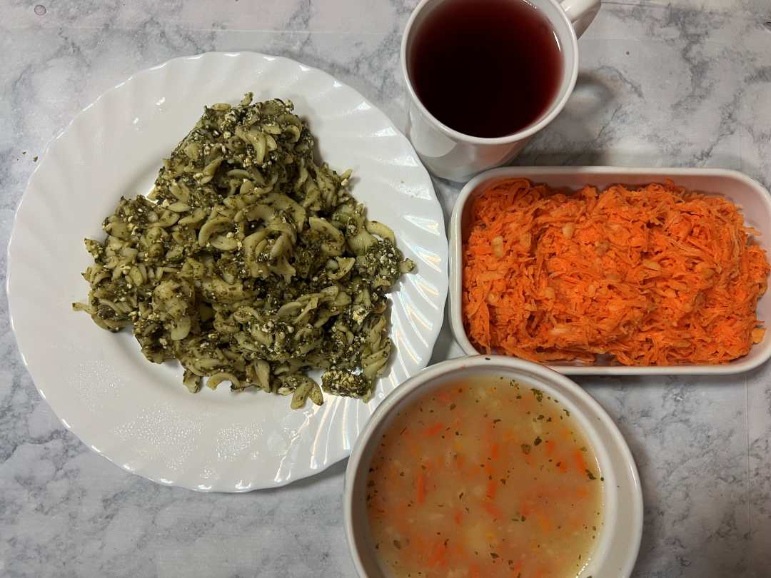 Obiad dieta łatwostrawna - krupnik ryżowy, makaron ze szpinakiem i twarogiem, marchewka z jabłkiem, kompot.