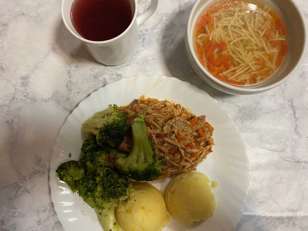 Obiad dieta lekkostrawna- rosół, wieprzowina szarpana w sosie pomidorowym z ziemniakami i brokułem, kompot.