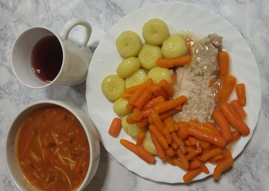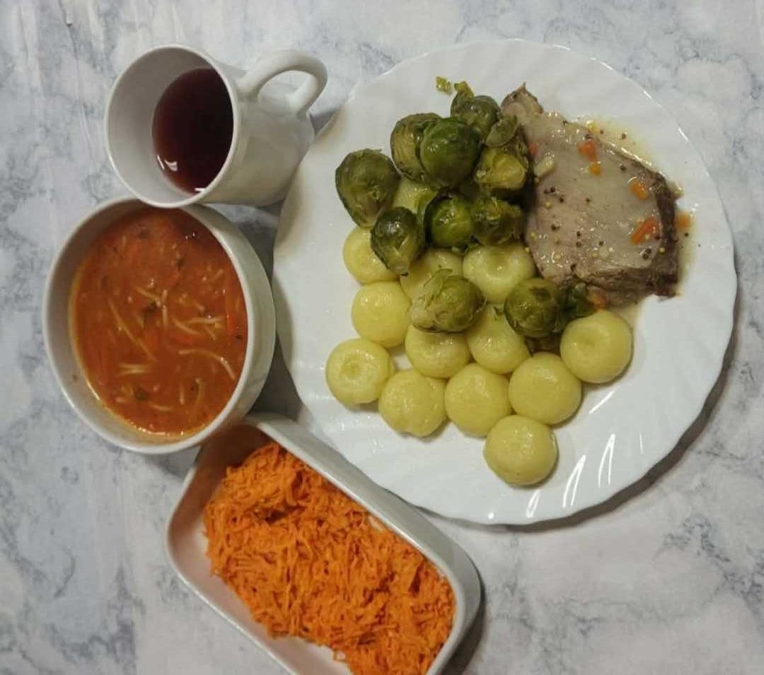 Obiad dieta łatwostrawna -  krem z dyni z grzankami, szarpana wołowina z sosem pieczeniowym, ziemniakami i mini marchewką, kompot.
