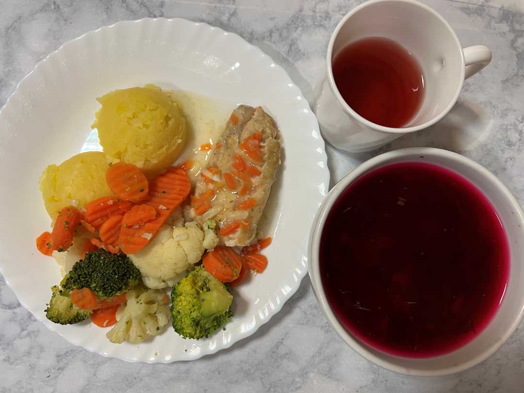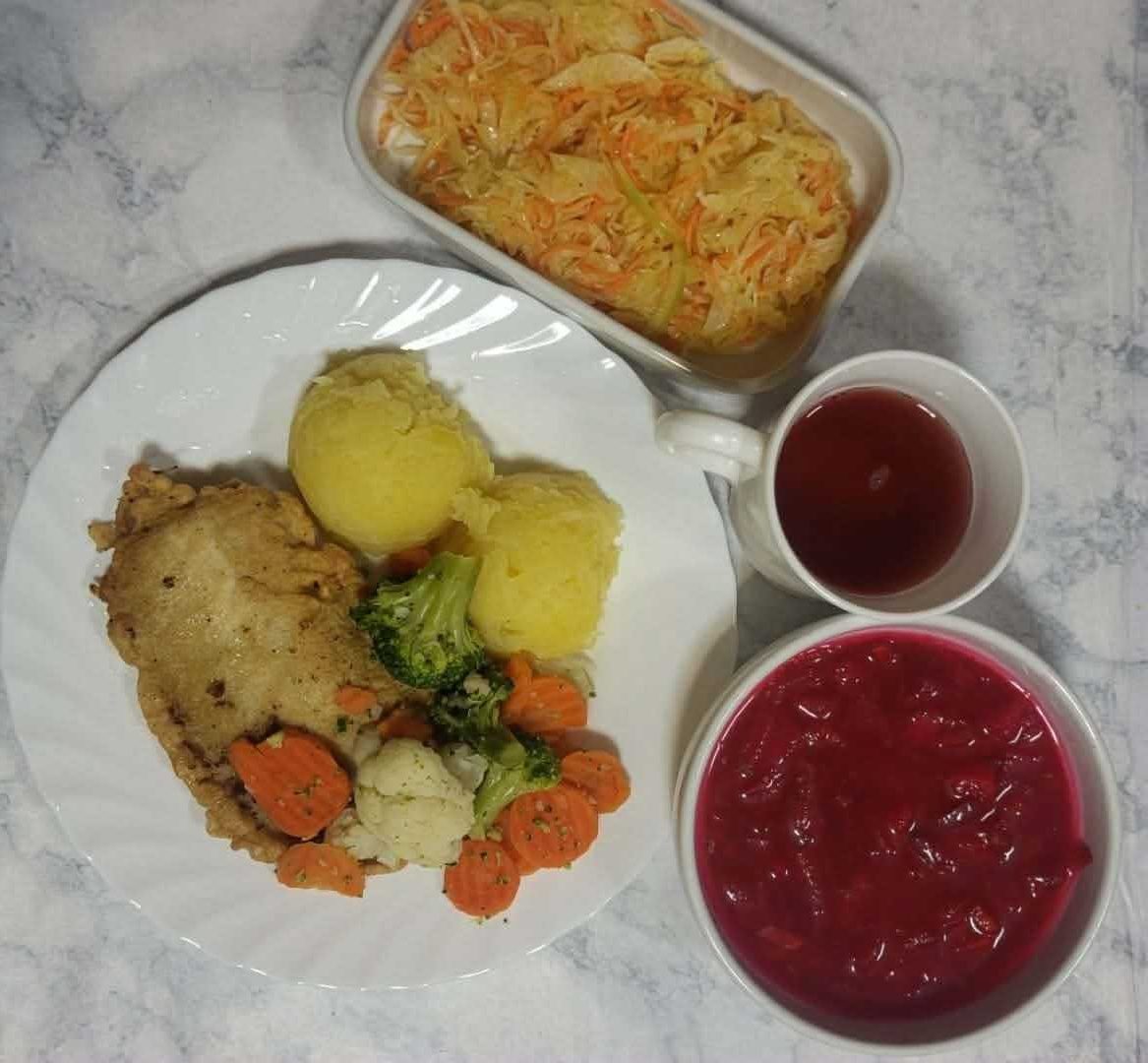 Obiad dieta podstawowa - zupa buraczkowa, dorsz panierowany z ziemniakami, warzywami gotowanymi i kiszoną kapustą, kompot.