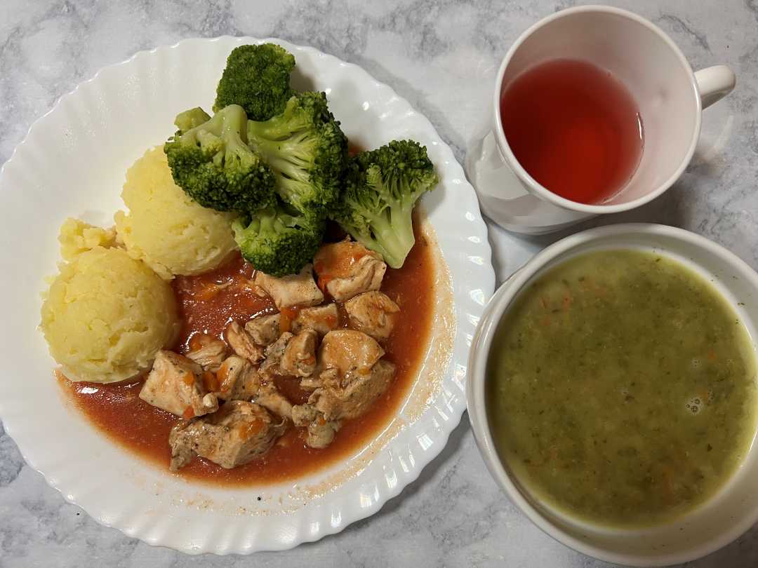 Obiad dieta podstawowa - zupa szpinakowa, krojony filet z kurczaka w sosie pomidorowym z ziemniakami i brokułem, kompot.