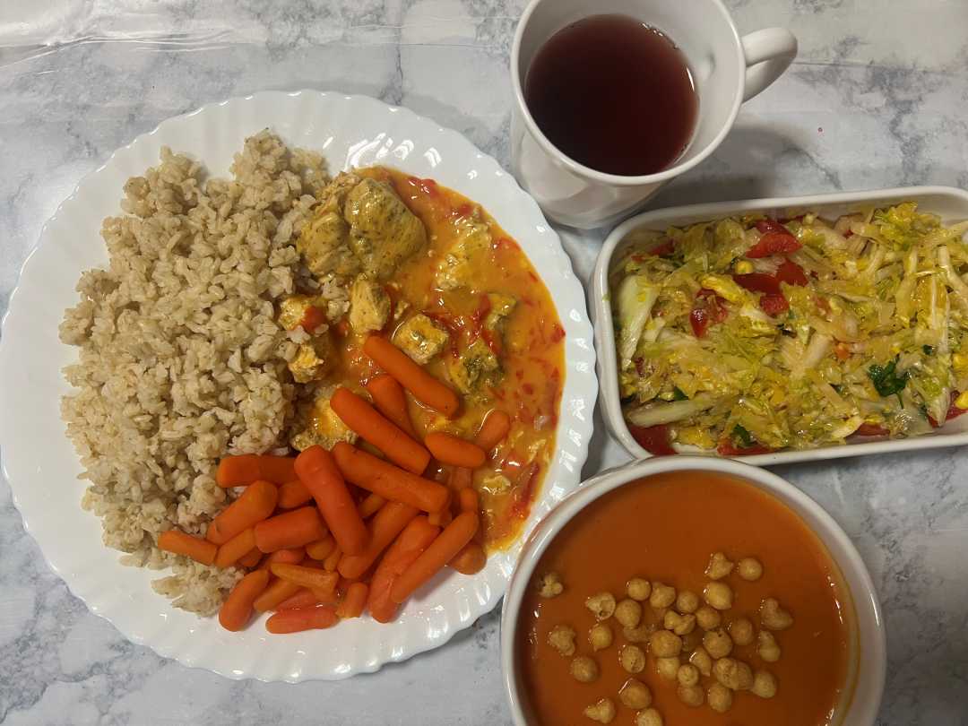 Obiad dieta podstawowa - krem pomidorowo-paprykowy z groszkiem ptysiowym, kurczak curry z brązowym ryżem, mini marchewką i surówką z papryką i kukurydzą, kompot.