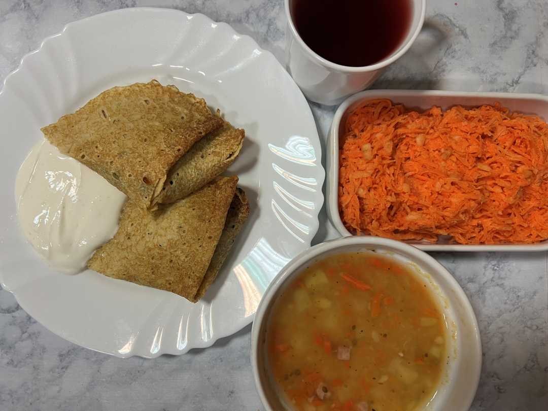 Obiad dieta podstawowa - grochowa z kiełbasą, naleśniki razowe ze szpinakiem i mozzarellą z sosem czosnkowym, marchewka z chrzanem, kompot.
