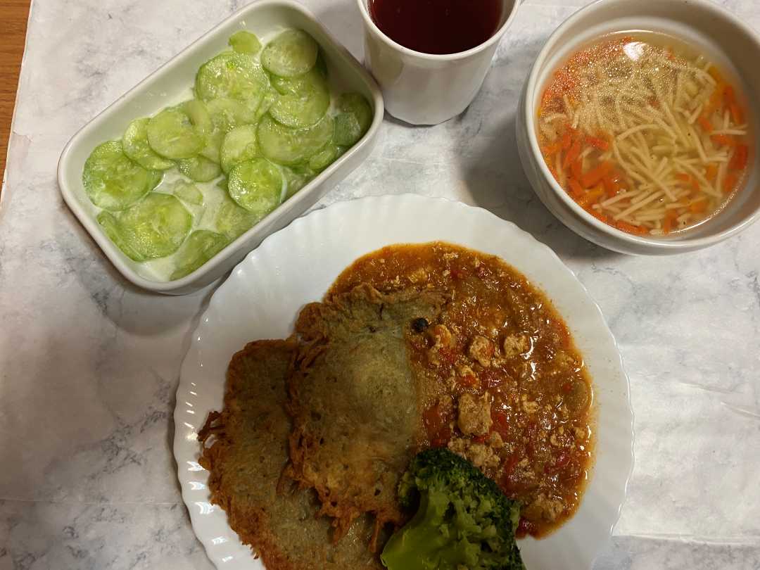 Obiad dieta podstawowa- rosół, placki ziemniaczane z sosem węgierskim z mizerią i brokułem, kompot.