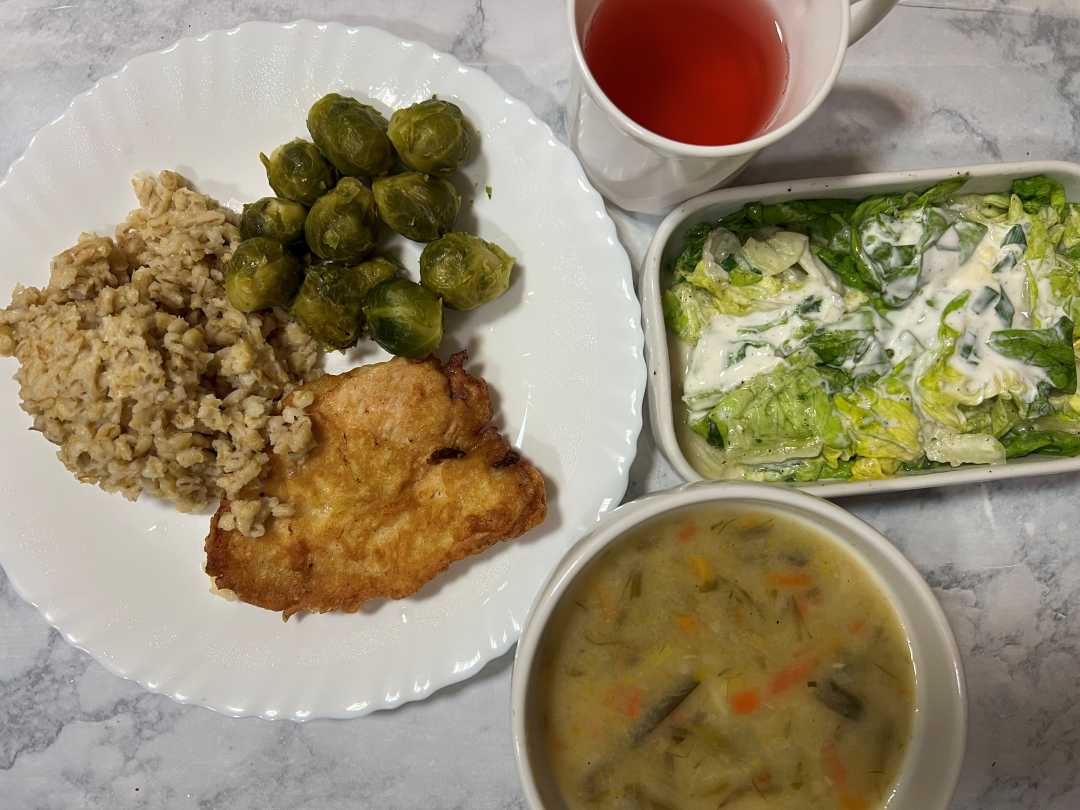 Obiad dieta podstawowa - zupa porowa, eskalopka z kurczaka z kaszą pęczak, brukselką i sałatą z kefirem, kompot.