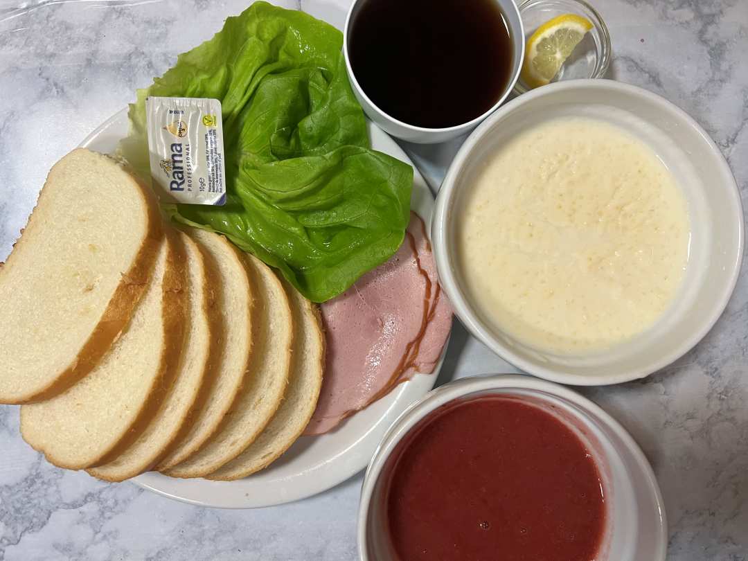 Śniadanie dieta łatwostrawna - kasza jaglana na mleku, bułka pszenna z margaryną, sałatą, płatem szynkowymi, mus z truskawek, herbata z cytryną.