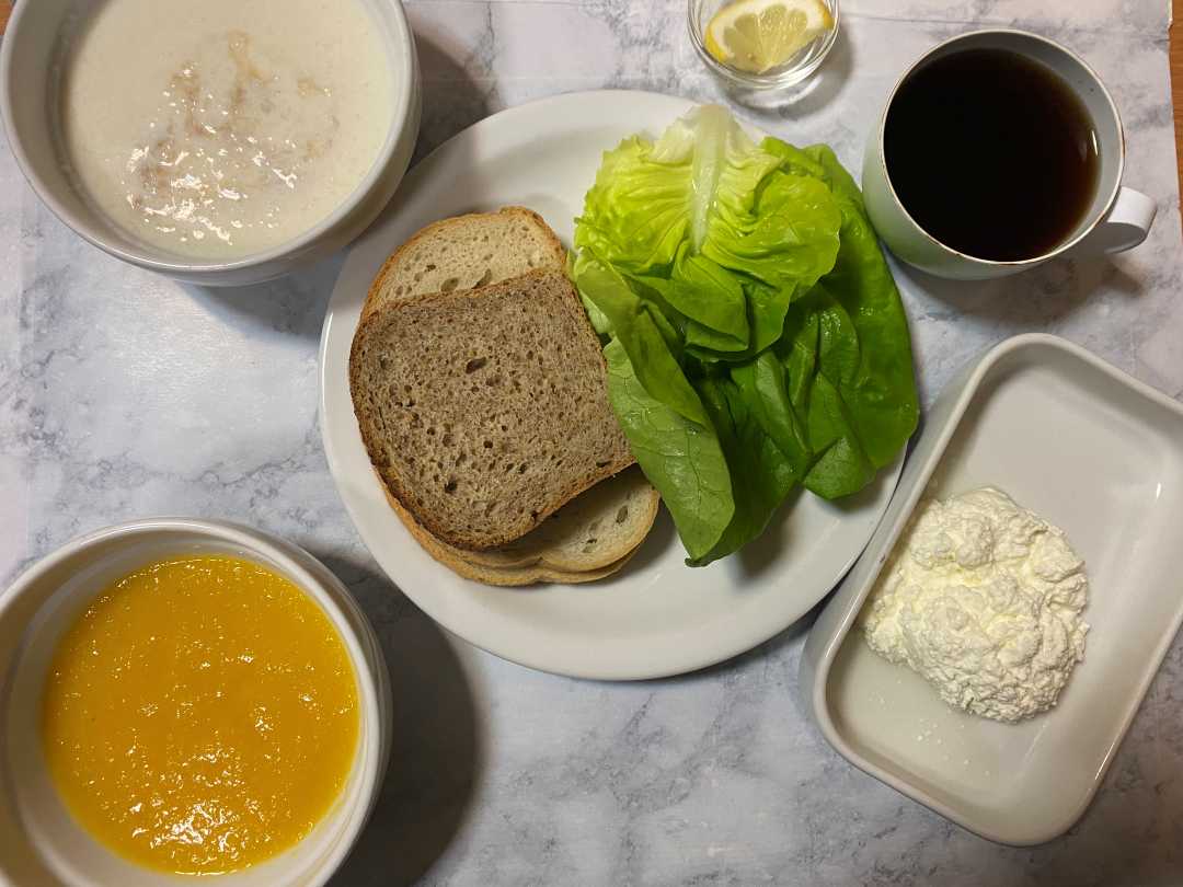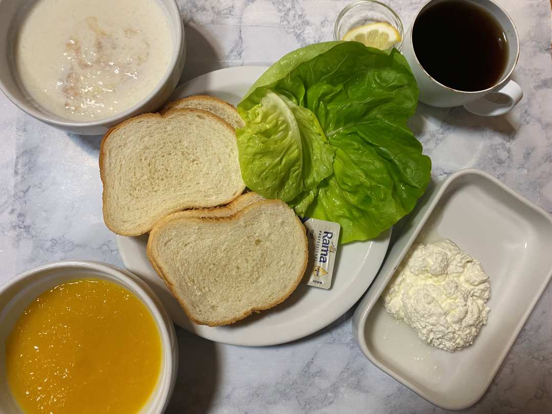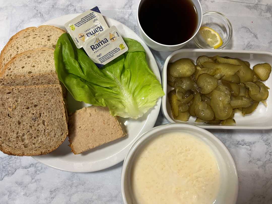 Śniadanie dieta podstawowa - kasza jaglana na mleku, mieszane pieczywo z margaryną, sałatą, pasztetem drobiowym i ogórkiem konserwowym, orzechy włoskie, herbata z cytryną.