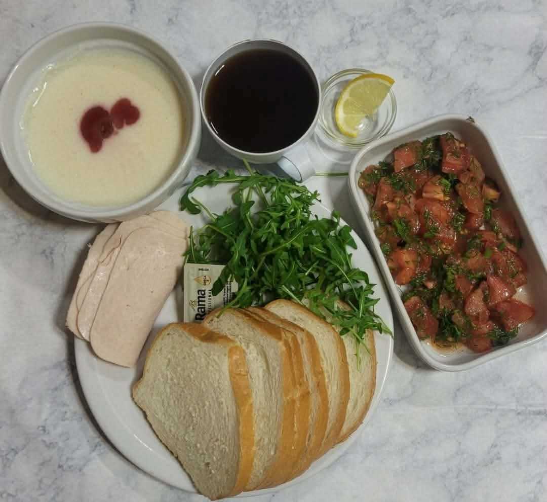 Śniadanie dieta lekkostrawna- kasza manna na mleku z musem z truskawek, bułka pszenna z margaryną, wędliną, sałatką z pomidorów i rukolą, herbata z cytryną.