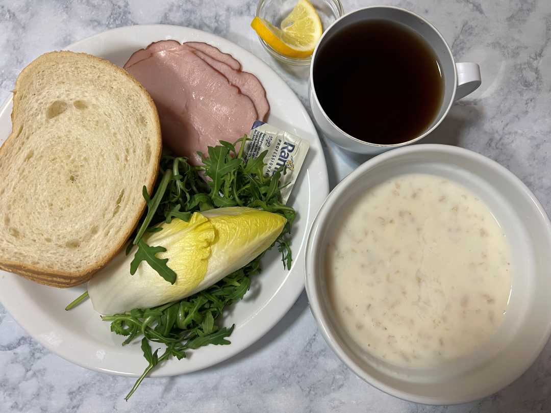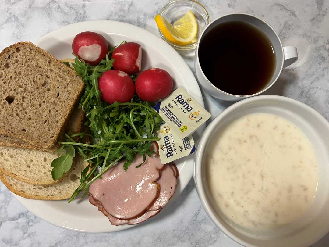 Śniadanie dieta podstawowa - owsianka na mleku, mieszane pieczywo z margaryną, rukolą, szynką "z liściem" i rzodkiewką, herbata z cytryną.