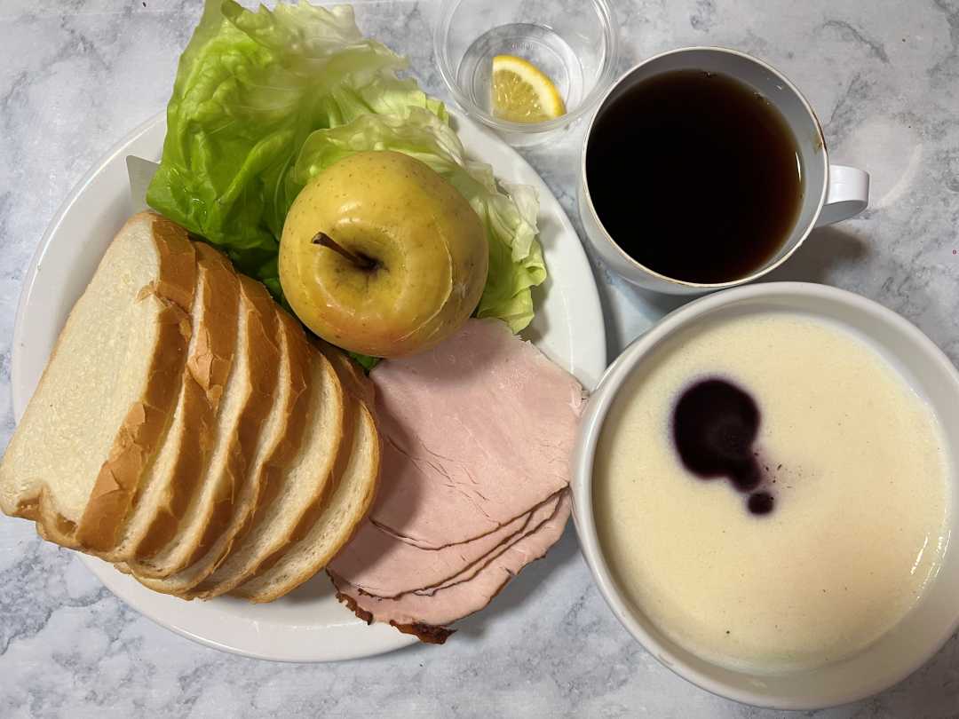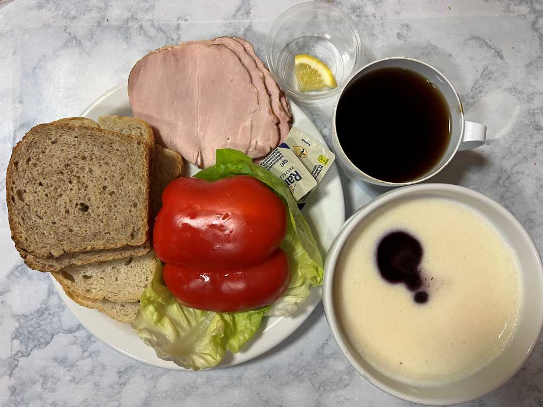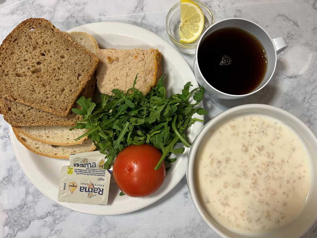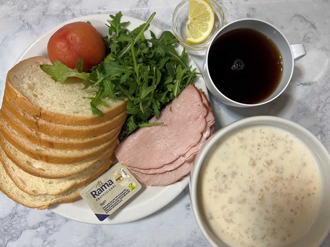 Śniadanie dieta podstawowa - kasza manna na mleku z musem z jagód, mieszane pieczywo z margaryną, sałatą, schabem na kartki i papryką, herbata z cytryną.