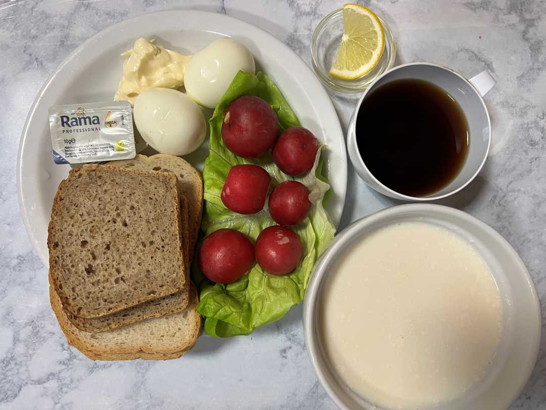 Śniadanie dieta podstawowa - makaron orzo na mleku z musem z jabłek, mieszane pieczywo z margaryną, sałatą i rzodkiewką, jajko z majonezem, herbata z cytryną.