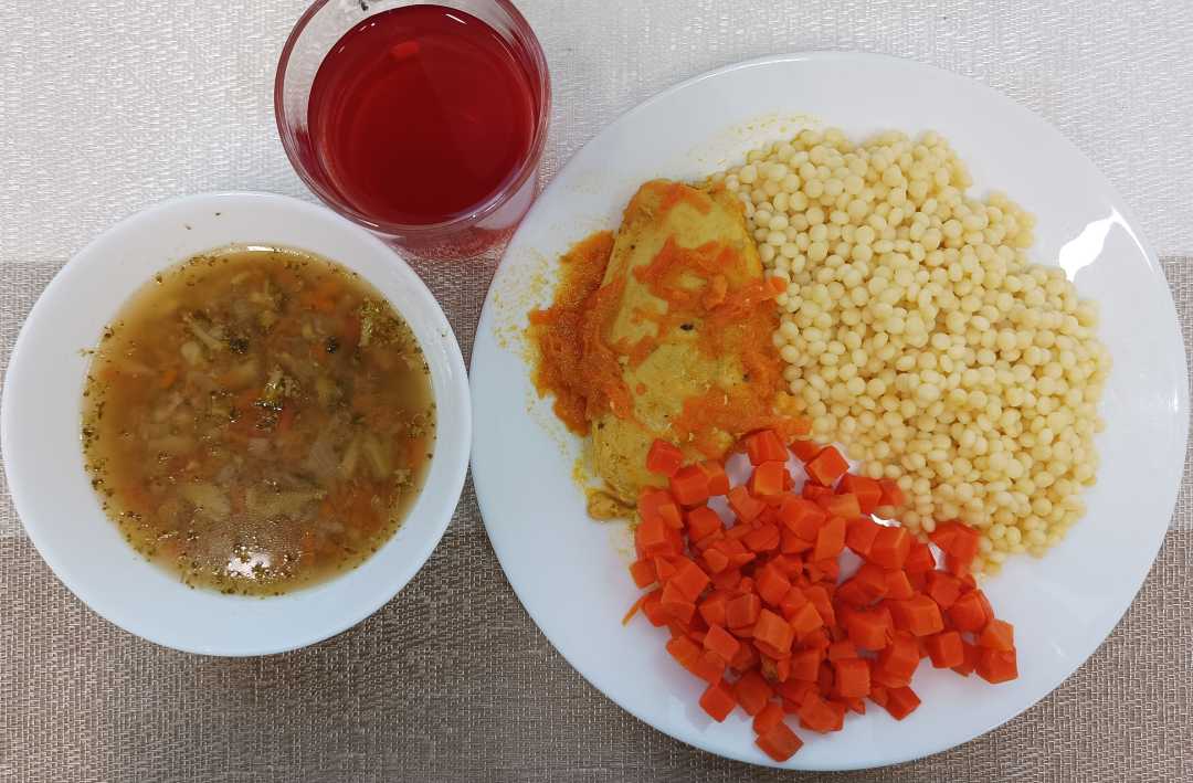 Zupa brokułowa z ziemniakami, Pierś z kurczaka w sosie jarzynowym z gotowaną kaszą kuskus oraz gotowaną marchewką, kompot owocowy.