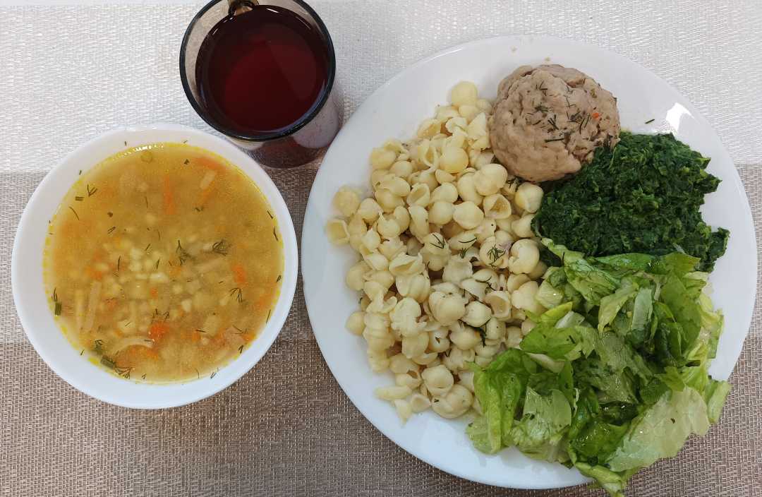 Obiad dieta łatwostrawna: Zupa zacierkowa, Klopsik wieprzowy w sosie ziołowym z gotowanym makaronem, duszonym szpinakiem oraz sałatą z olejem i ziołami, kompot owocowy.