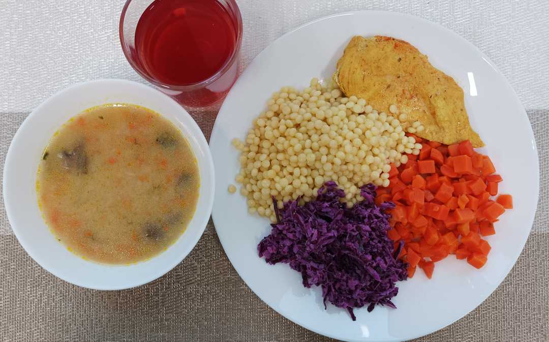 Zupa pieczarkowa, Pierś z kurczaka w curry z gotowaną kaszą kuskus, gotowaną marchewką oraz surówką z czerwonej kapusty, kompot owocowy.