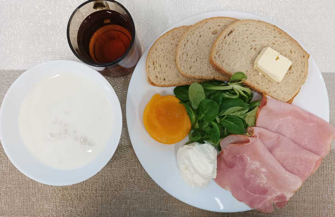 Śniadanie dieta podstawowa: Kasza jaglana na mleku z musem owocowym, Omlet na parze z szynką, Kanapki z pieczywa mieszanego z margaryną, żółtym serem, rukolą oraz pomidorem, herbata czarna.