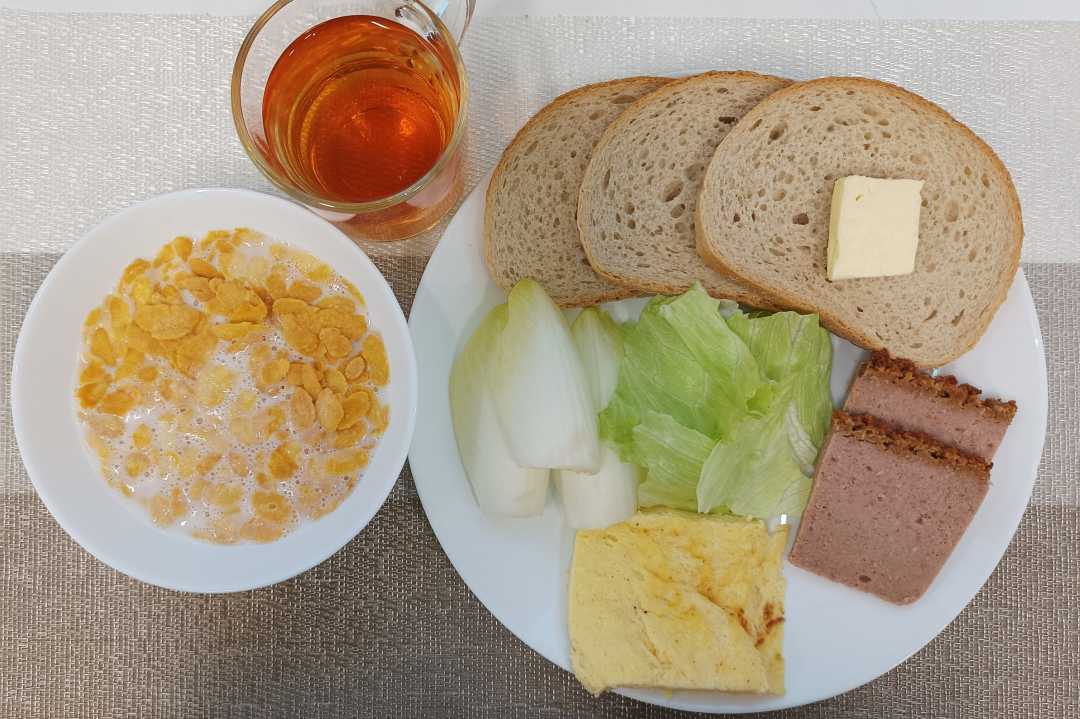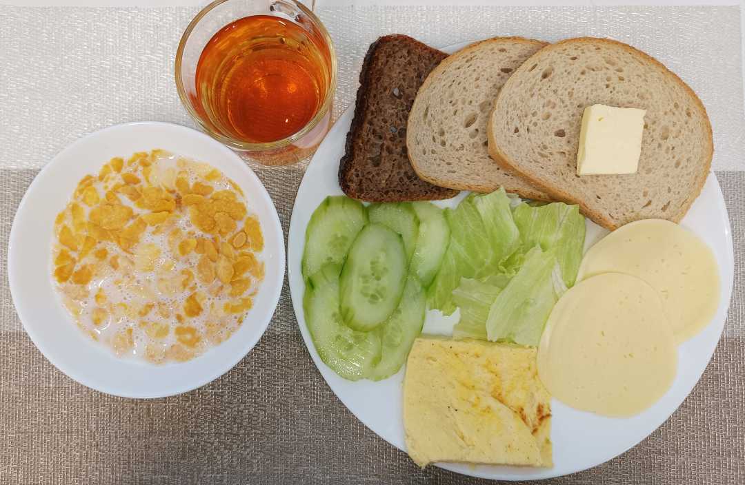 Śniadanie dieta podstawowa: Płatki kukurydziane na mleku, Jajecznica na parze, Kanapki z pieczywa mieszanego z margaryną, żółtym serem, sałatą lodową oraz zielonym ogórkiem, herbata czarna.