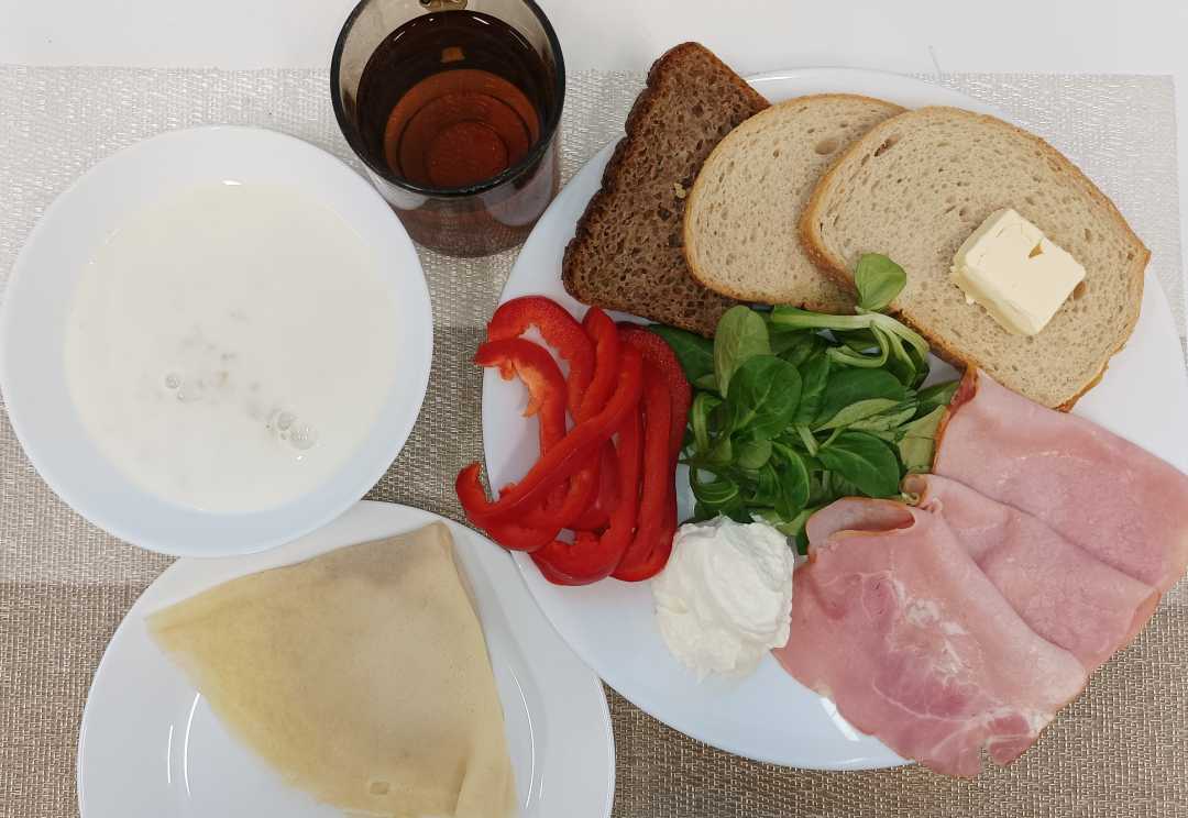 Śniadanie dieta podstawowa: Zacierka na mleku, Kanapki z pieczywa mieszanego z margaryną, szynką drobiową, serkiem homogenizowanym naturalnym, sałatą lodową, papryką oraz mandarynką, herbata czarna.
