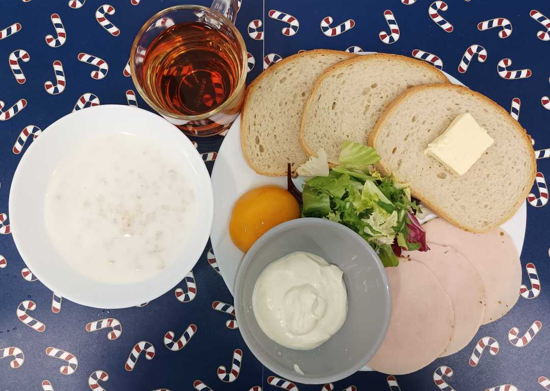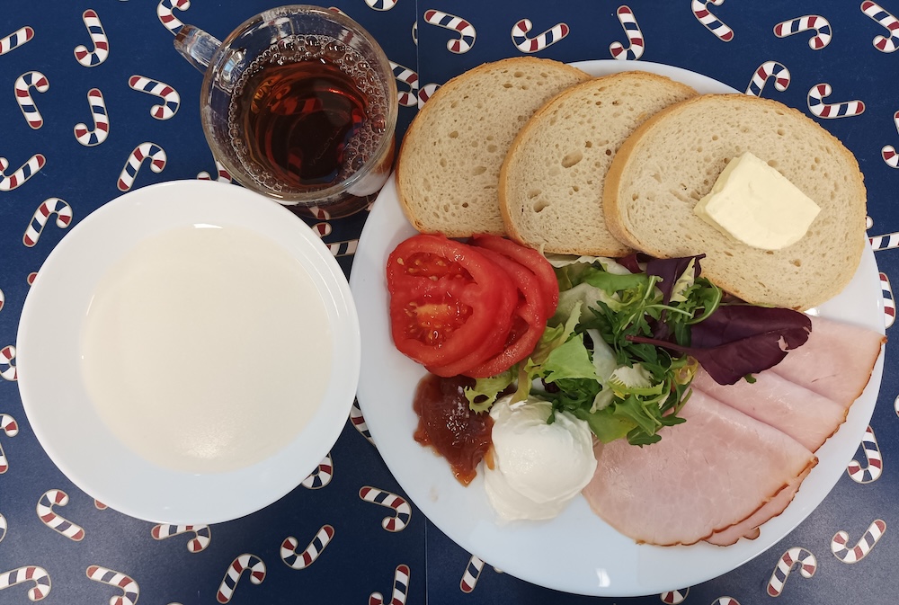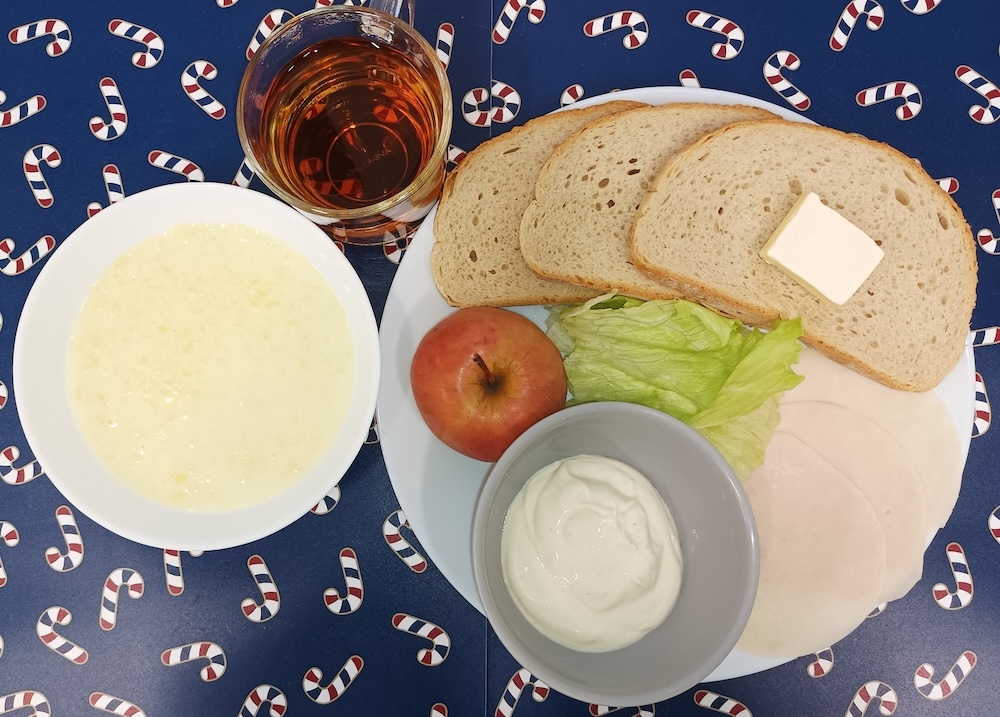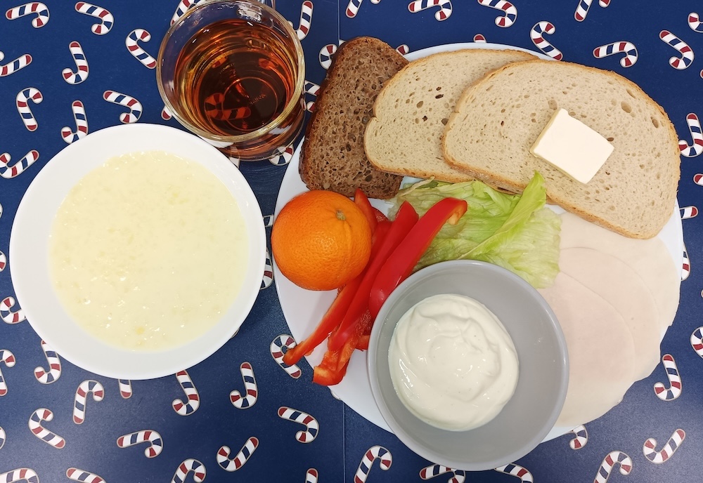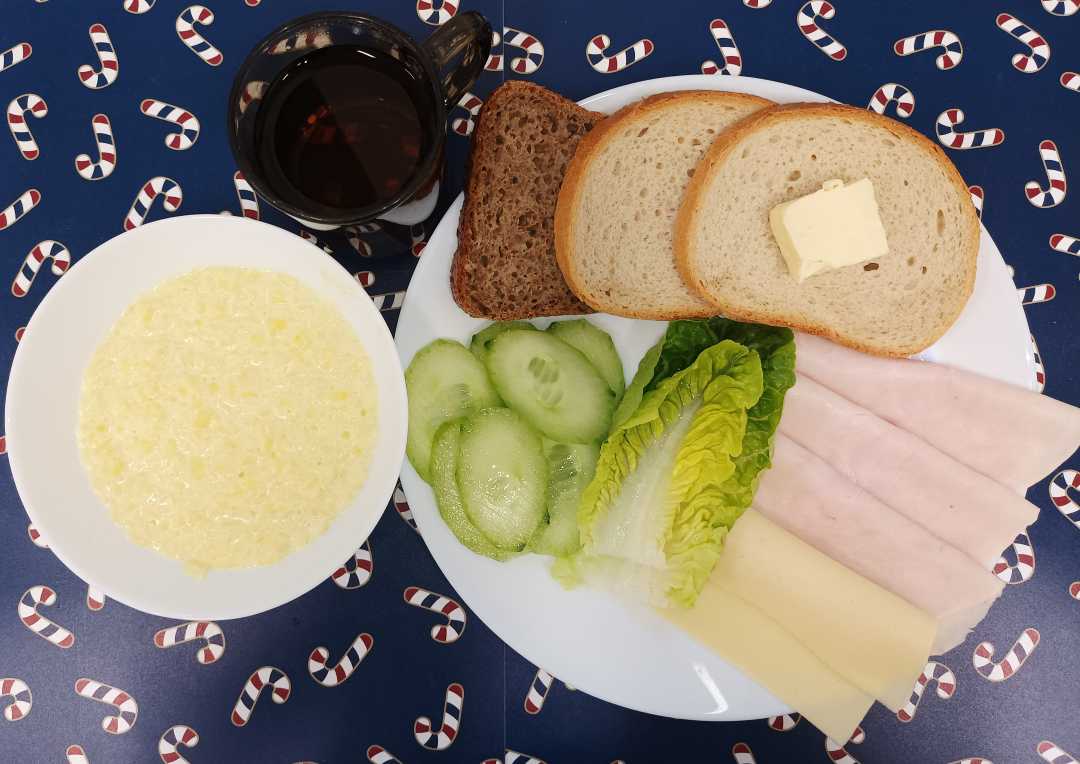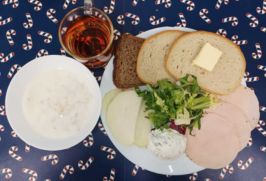 Śniadanie dieta podstawowa: Płatki owsiane na mleku, Kanapki z pieczywa mieszanego z margaryną, szynką drobiową, twarożkiem z koperkiem, mixem sałat oraz kalarepą, herbata czarna.