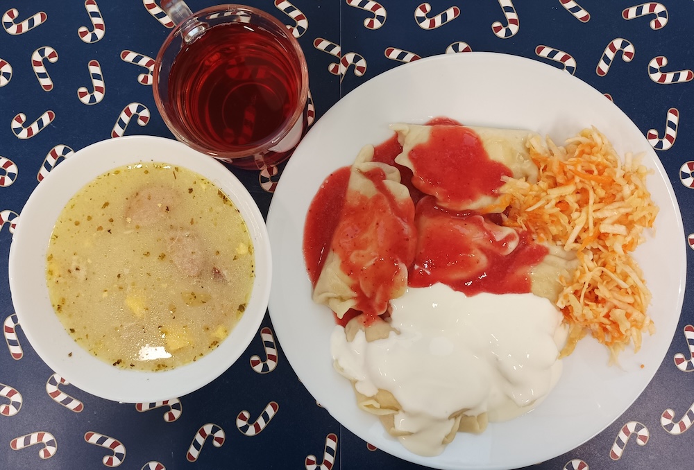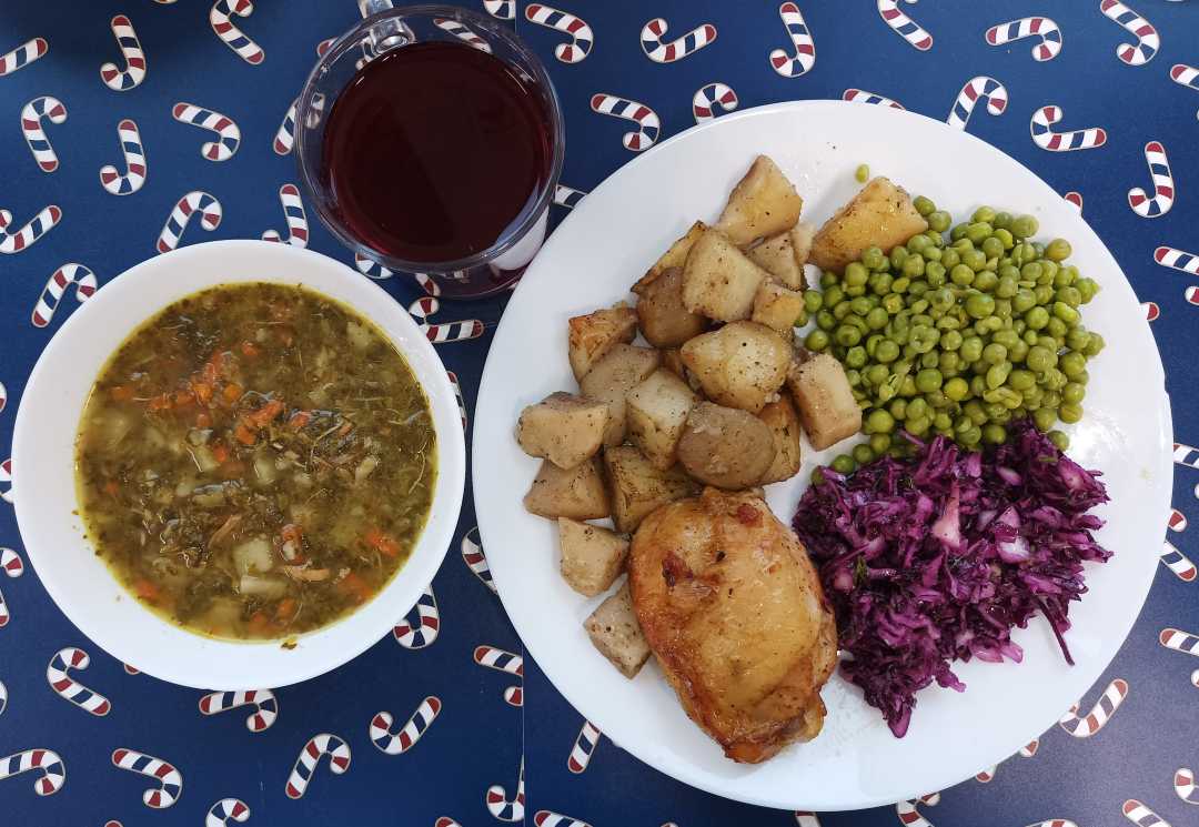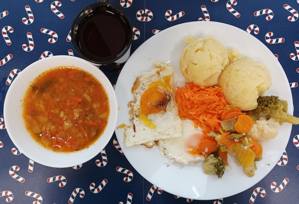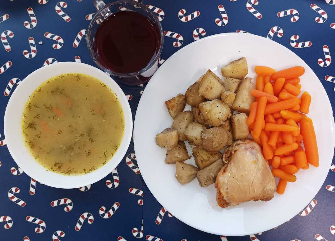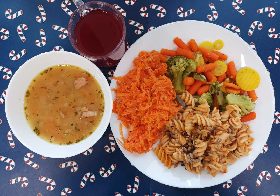 Zupa solferino, Jajka sadzone na parze z gotowanymi ziemniakami, gotowanym bukietem warzyw oraz surówką z marchewki, kompot owocowy.