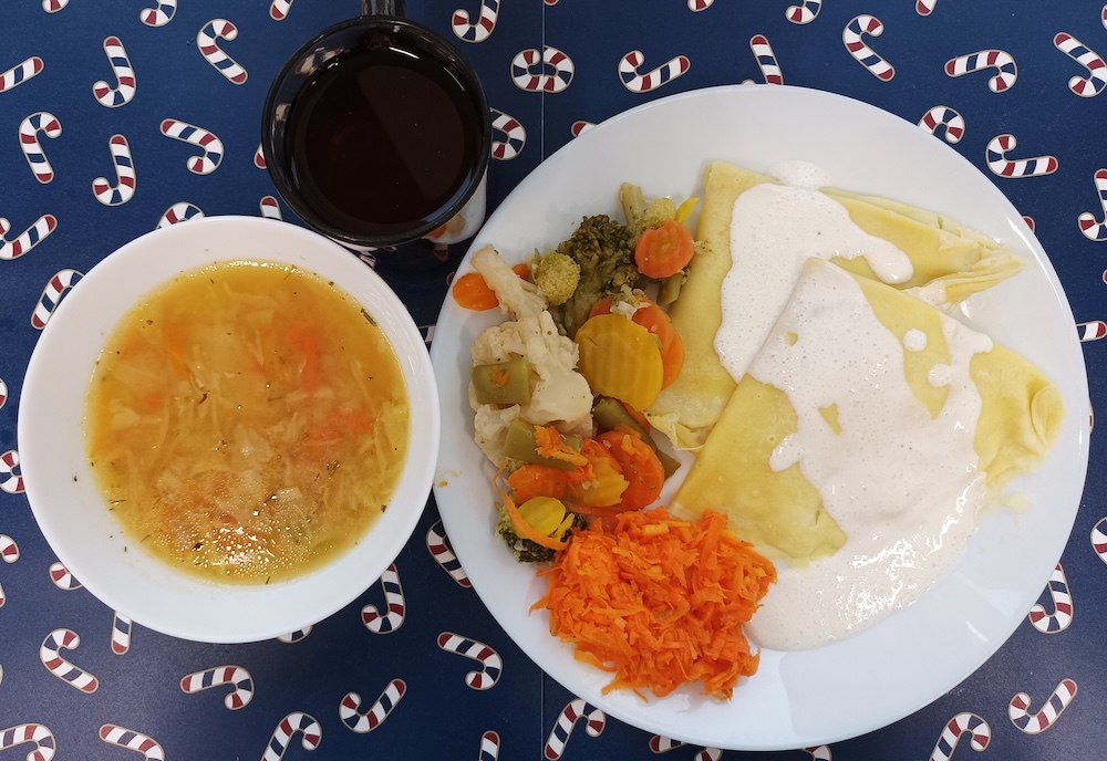 Dieta podstawowa: Zupa kapuśniak, Naleśniki ze szpinakiem i twarogiem z sosem jogurtowo-czosnkowym, gotowanym bukietem warzyw oraz surówką z marchewki, kompot owocowy.
