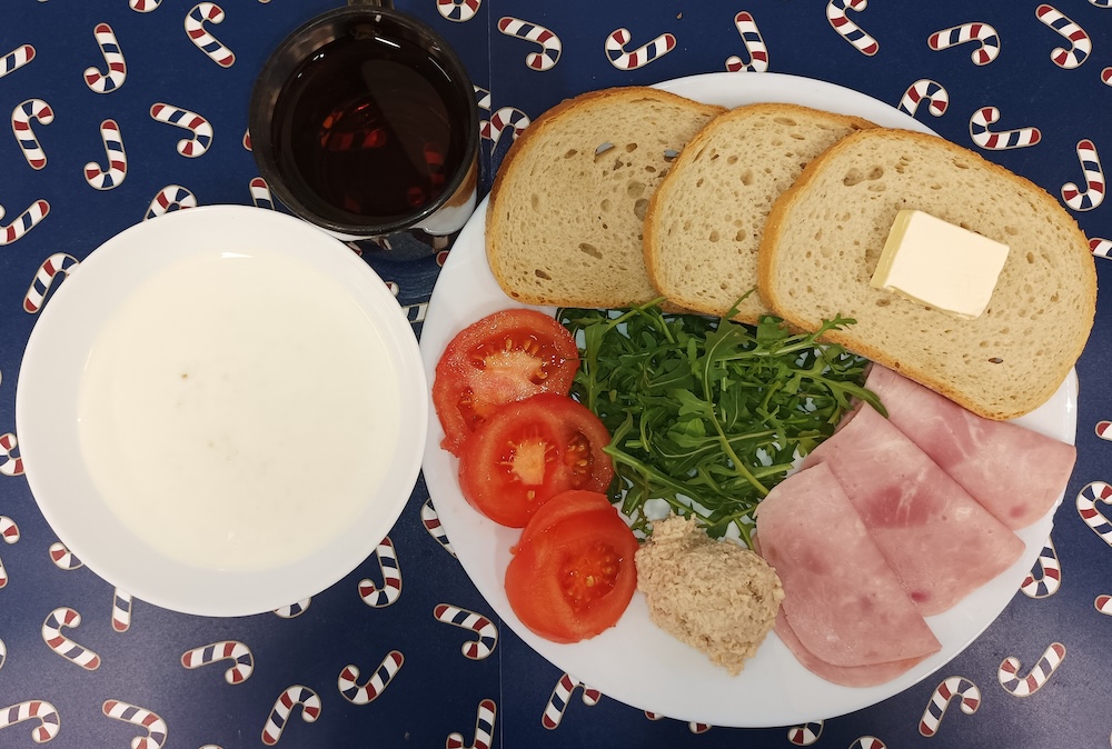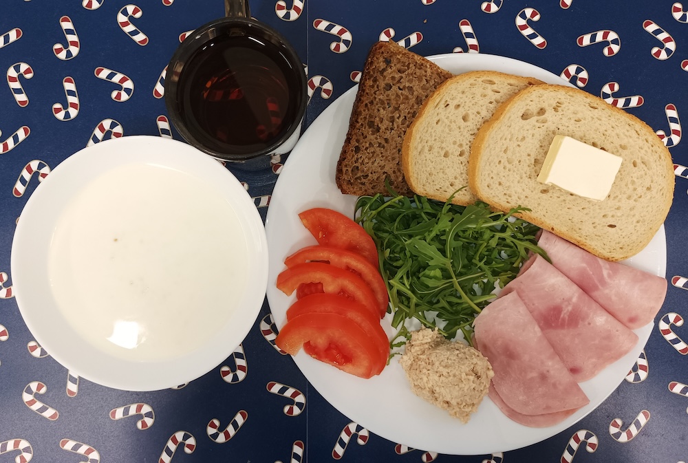 Dieta podstawowa: Kasza jaglana na mleku, Kanapki z pieczywa mieszanego z margaryną, szynką konserwową, pastą z kurczaka, rukolą oraz pomidorem, herbata czarna