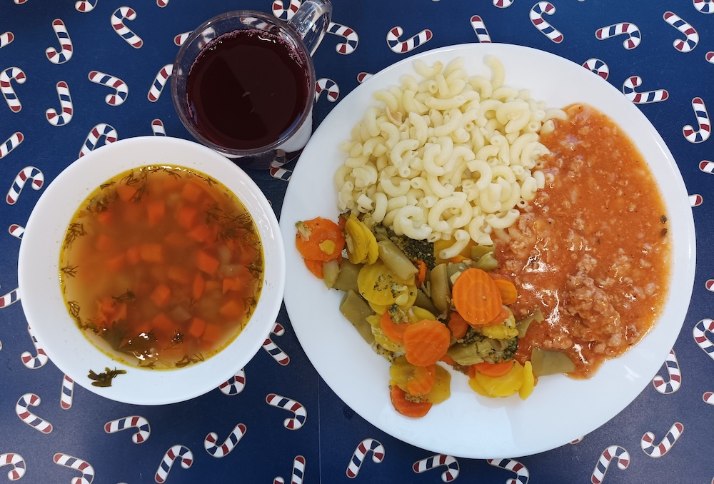 Zupa koperkowa, Mięso wieprzowe w sosie bolońskim z gotowanym makaronem oraz gotowanym mixem warzyw wiosennych, kompot owocowy.
