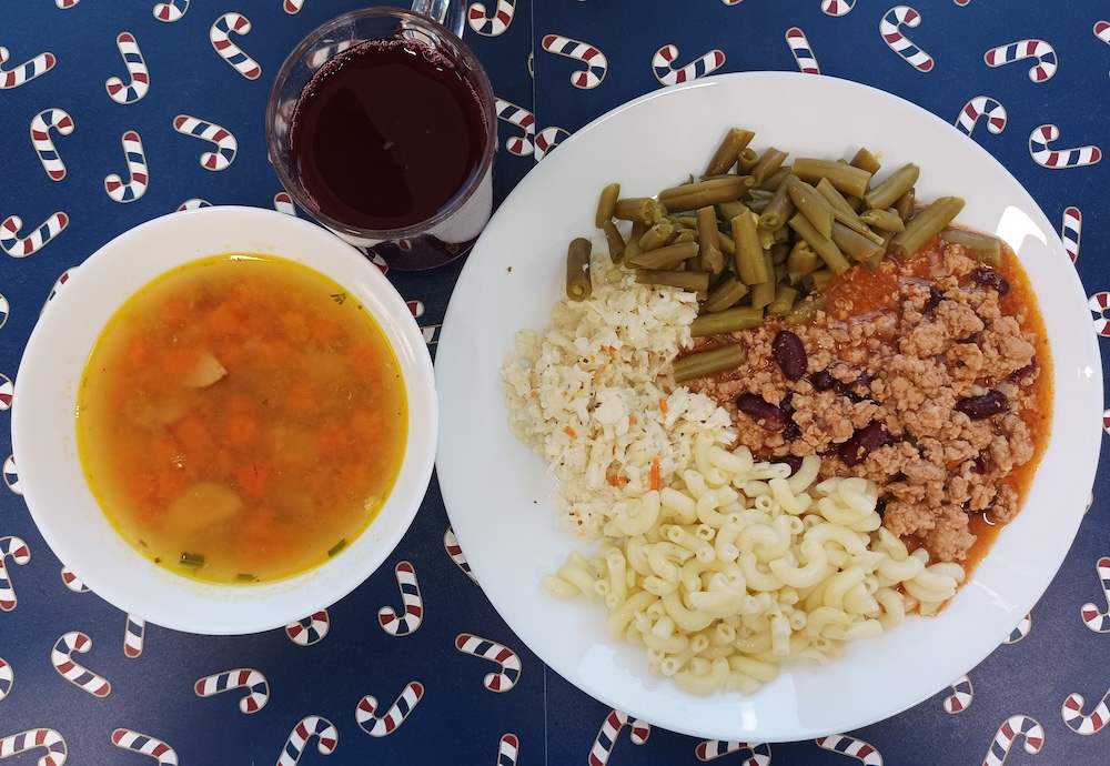Dieta podstawowa: Zupa grochowa, Mięso mielone w sosie z czerwoną fasolą z gotowanym makaronem, gotowaną fasolką szparagową oraz surówką colesław, kompot owocowy.