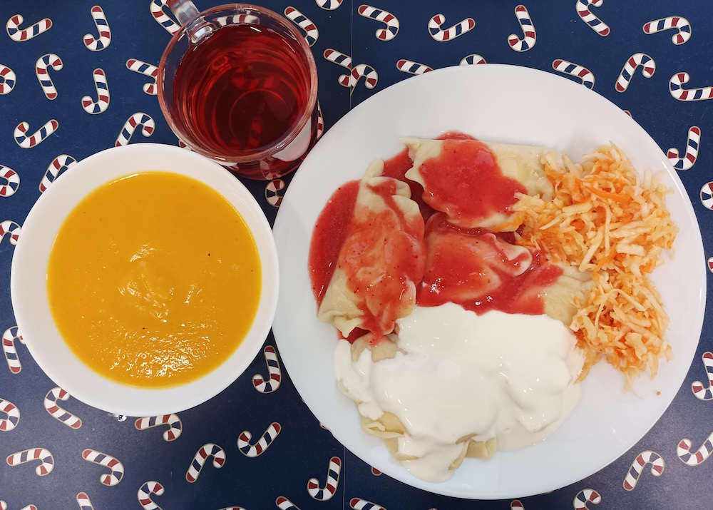 Zupa krem z dyni, Pierogi z chudym białym serem z musem truskawkowym, sosem jogurtowym oraz surówką z selera, kompot owocowy.